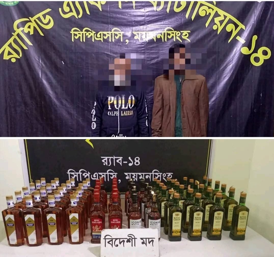ময়মনসিংহ সিপিএসসি, র্যাব-১৪, এর একটি আভিযানিক দল গোপন সংবাদের ভিত্তিতে ১৭ নভেম্বর ২০২৫খ্রিঃ রাত অনুমান ২২:৩০ ঘটিকায় ময়মনসিংহ জেলার কোতোয়ালী থানাধীন আলালপুর সাকিনস্থ এম এ খালেক ফিলিং স্টেশনের সামনে হালুয়াঘাট-ময়মনসিংহ পাকা রাস্তার উপর স্হাপনকৃত চেকপোস্টে হালুয়াঘাট থেকে ছেড়ে আসা একটি নীল ও হলুদ রংয়ের পিকআপ চেকপোস্ট অতিক্রম করলে সিগনাল দিয়ে থামায়। ধৃত মাদককারবারিদের প্লাস্টিকের বস্তায় থাকা মালমালের বিষয়ে জিজ্ঞাসাবাদ করলে কোন সন্তোষজনক উত্তর না দিলে ব্যাপকভাবে জিজ্ঞাসাবাদে তারা অবৈধ মাদক থাকার কথা স্বীকার করে। ধৃত মাদককারবারিগন ১। মোঃ আব্দুস সালাম (৪০) এবং ২। মোঃ আব্দুল হালিম (৩৫), থানা-নালিতাবাড়ী, জেলা-শেরপুর’দ্বয়কে গ্রেফতার পূর্বক উপস্থিত সাক্ষীদের সম্মুখে তাদের দেয়া তথ্যের ভিত্তিতে পিকআপটি তল্লাশী করে ৭২ (বাহাত্তর) বোতল বিদেশী মদ, ০২টি মোবাইল ফোন এবং একটি পিকআপ উদ্ধার পূর্বক জব্দ করতে সক্ষম হয়। উদ্ধারকৃত অবৈধ বিদেশী মদের আনুমানিক অবৈধ বাজার মূল্যে ৭,২০,০০০/- (সাত লক্ষ বিশ হাজার) টাকা