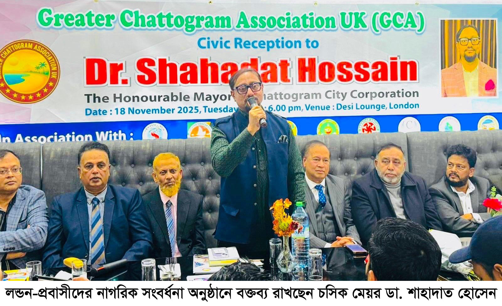 স ম জিয়াউর রহমান, চট্টগ্রাম থেকে: যুক্তরাজ্যের প্রভাবশালী প্রবাসী সংগঠন গ্রেটার চট্টগ্রাম এসোসিয়েশন ইউকে-এর উদ্যোগে লন্ডন সফররত চট্টগ্রাম সিটি করপোরেশনের মেয়র ডা. শাহাদাত হোসেনকে এক নাগরিক সংবর্ধনা দেওয়া হয়েছে। ১৮ নভেম্বর ২০২৫, মঙ্গলবার সন্ধ্যা ৬টায় পূর্ব লন্ডনের দেশি লাউঞ্জ রেস্টুরেন্টে আয়োজিত এ অনুষ্ঠানটি চট্টগ্রাম ও বাংলাদেশের বিভিন্ন কমিউনিটির নেতা-কর্মীদের মিলনমেলায় পরিণত হয়।