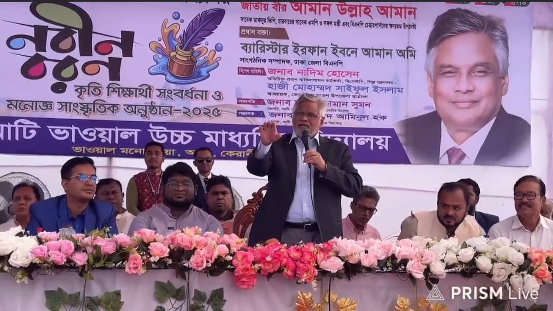 আজ বুধবার (২৬ নভেম্বর) কেরানীগঞ্জের আঁটি ভাঁওয়াল উচ্চ মাধ্যমিক বিদ্যালয়ের নবীনবরণ অনুষ্ঠানে প্রধান অতিথির বক্তব্যে আমান এসব কথা বলেন।