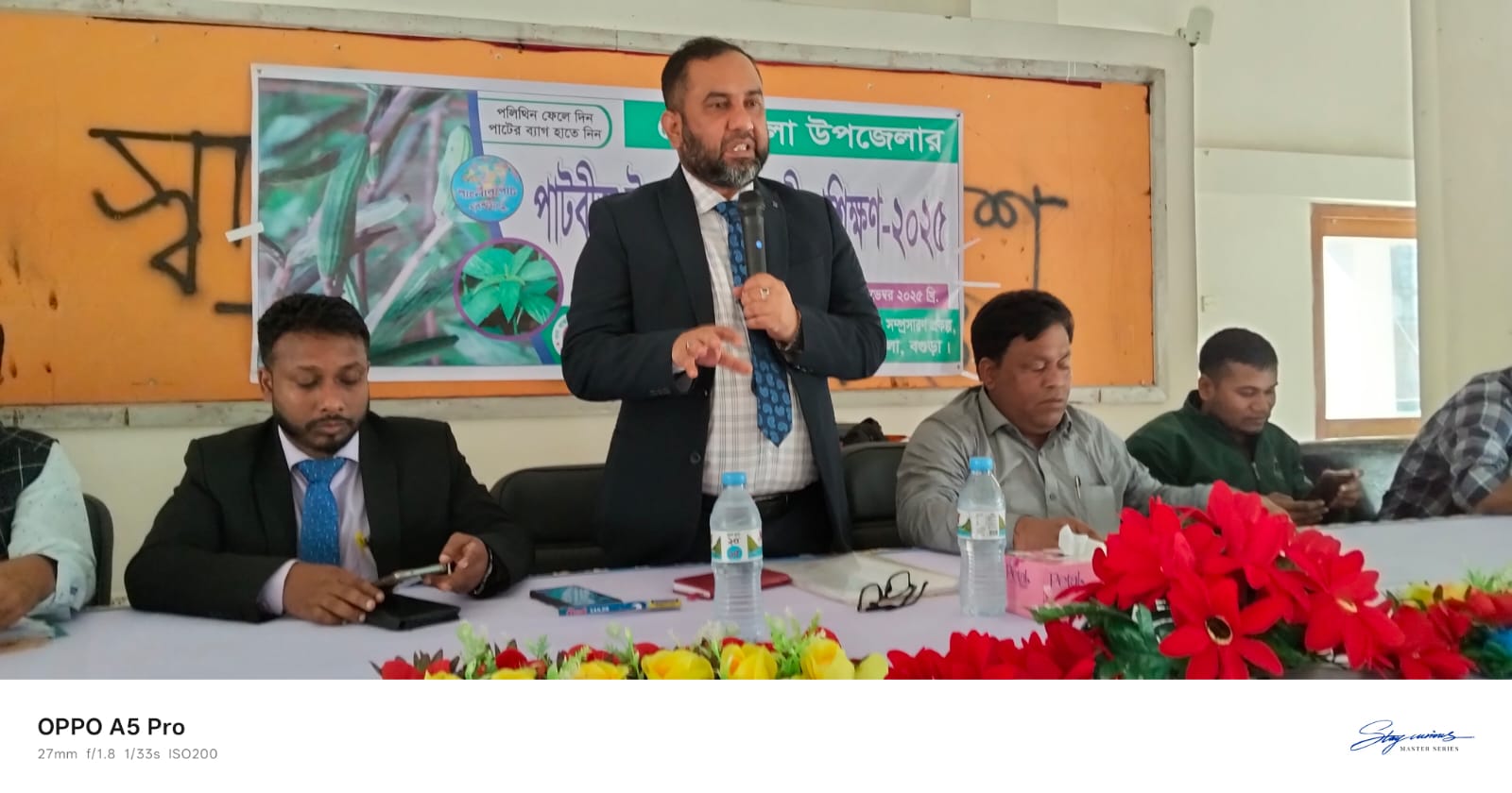 বিকাশ স্বর্ণকার, বগুড়া:"পলিথিন ফেলে দিন'পাটের ব্যাগ হাতে নিন" মুল প্রতিপাদ্যকে সামনে রেখে বগুড়া সোনাতলায় পাটবীজ উৎপাদনকারী চাষী প্রশিক্ষণ-২০২৫ অনুষ্ঠিত হয়েছে। গতকাল বৃহস্পতিবার((২৭শে নভেম্বর) উন্নত প্রযুক্তি নির্ভর পাট ও পাটবীজ উৎপাদন এবং সম্প্রসারণ প্রকল্প কর্তৃক আয়োজিত পরিষদের হল রুমে এই প্রশিক্ষণ অনুষ্ঠিত হয়। এই প্রশিক্ষণে উপজেলার প্রান্তিক চাষীরা অংশগ্রহণ করেন। এতে প্রধান অতিথি হিসেবে উপস্থিত ছিলেন বগুড়া কৃষি সম্প্রসারণ অধিদপ্তর এর উপ-পরিচালক সোহেল মোঃ শামসুদ্দিন ফিরোজ। এছাড়াও বক্তব্য রাখেন উপজেলা কৃষি কর্মকর্তা কৃষিবিদ সোহরাব হোসেন। আরো উপস্থিত ছিলেন জেলা পাট উন্নয়ন কর্মকর্তা আব্দুল হালিম(জেডিও),কৃষিবিদ ওসমান শেখ,উপ-সহকারী পাট উন্নয়ন কর্মকর্তা মিঠু কুমার সাহা,জেলা অফিস সহকারি রুহিত ইসলাম প্রমুখ । প্রধান অতিথি পাট চাষের উপর গুরুত্ব আরোপ করে বলেন আর যাতে করে আমাদের প্রতিবেশী দেশ থেকে পাট বীজ আমদানি করতে না হয় সে দিকে খেয়াল রাখতে এ অঞ্চলের কৃষকদের প্রতি আহ্বান জানান