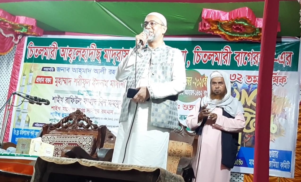 শুক্রবার (২৮ নভেম্বর) রাত ৮টার দিকে আড়ুয়াবর্নী চরপাড়াস্থ আহলেহাদীছ মাদরাসা ও ইয়াতীমখানার ৩২তম বার্ষিক ওয়াজ মাহফিলে প্রধান অতিথির বক্তব্যে তিনি এ আহ্বান জানান।