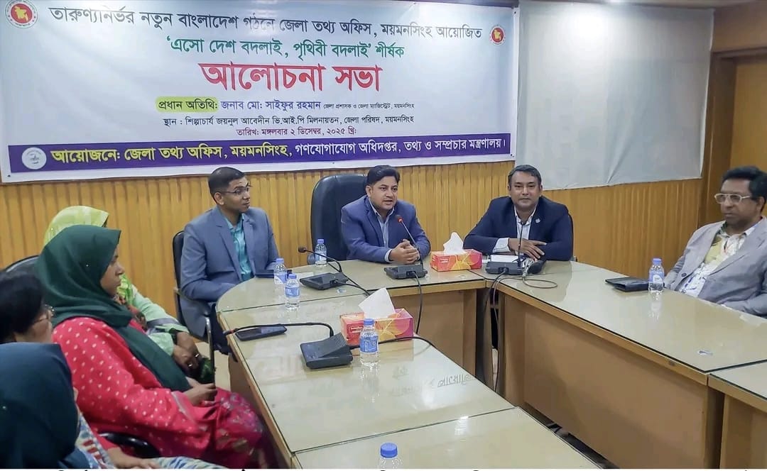 মকবুল হোসেন,ময়মনসিংহ জেলা প্রতিনিধি: ময়মনসিংহ জেলা তথ্য অফিস, আয়োজনে তারুণ্য নির্ভর নতুন বাংলাদেশ গঠনে 'এসো দেশ বদলাই, পৃথিবী বদলাই' শীর্ষক আলোচনা সভা অনুষ্ঠিত হয়েছে। ময়মনসিংহ জেলা পরিষদের শিল্পাচার্য জয়নুল আবেদীন মিলনায়তনে আজ ০২ ডিসেম্বর মঙ্গলবার বিকেলে এ সভা অনুষ্ঠিত হয়।