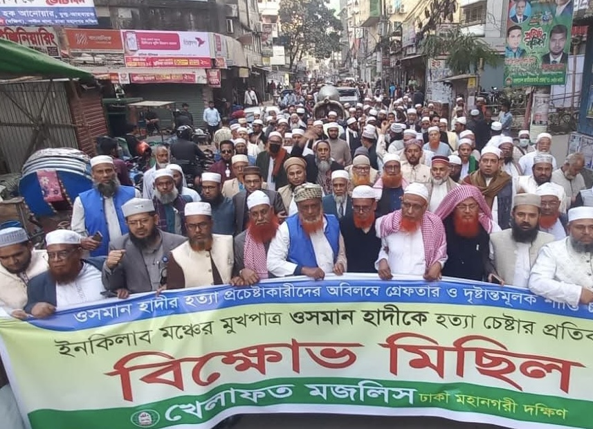 নিউজ ডেস্ক : আজ ১৩ ডিসেম্বর শনিবার বিকাল ৪টায় বিজয়নগর বক্স কাল ভাট রোড থেকে খেলাফত মজলিস ঢাকা মহানগরী শাখার উদ্যোগে ইনকিলাব মঞ্চের মুখপাত্র শরিফ ওসমান হাদির উপর বর্বরোচিত হামলার প্রতিবাদে বিক্ষোভ মিছিল অনুষ্ঠিত হয়।