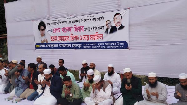 নিউজ ডেস্ক : বিএনপির চেয়ারপার্সন বেগম খালেদা জিয়ার আশু রোগমুক্তি ও দীর্ঘায়ু কামনা করে খতমে কোরআন মিলাদ ও দোয়া মাহফিল অনুষ্ঠিত হয়। মঙ্গলবার বাদ আছর রাজধানীর উত্তরা ১১ নং সেক্টর