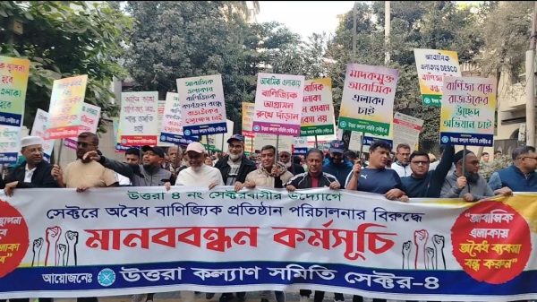উত্তরা প্রতিনিধি:উত্তরা ৪ নম্বর সেক্টরবাসীর উদ্যোগে সেক্টরের আবাসিক এলাকায় অবৈধভাবে পরিচালিত বাণিজ্যিক প্রতিষ্ঠানের বিরুদ্ধে মানববন্ধন ও প্রতিবাদ কর্মসূচি অনুষ্ঠিত হয়েছে। শুক্রবার (১৯ ডিসেম্বর) সকাল ৭টায় উত্তরা ৪ নম্বর সেক্টরের বিভিন্ন