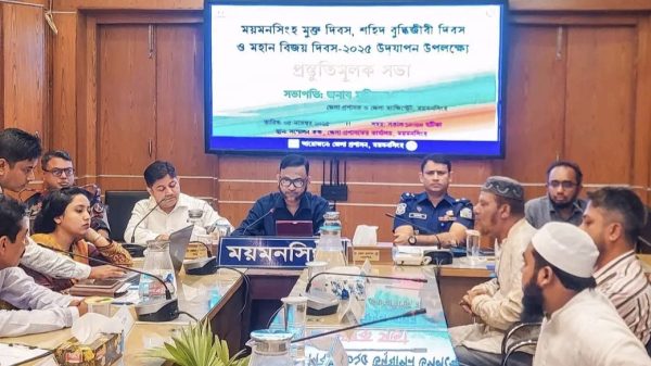 মকবুল হোসেন, ময়মনসিংহ জেলা প্রতিনিধি: ময়মনসিংহ মুক্ত দিবস, শহীদ বুদ্ধিজীবী দিবস ও মহান বিজয় দিবস-২০২৫ উদযাপন উপলক্ষ্যে ময়মনসিংহে প্রস্তুতিকমূলক সভা আজ বুধবার (০৫ নভেম্বর) ময়মনসিংহ জেলা প্রশাসনের আয়োজনে দপ্তর কার্যালয়ের