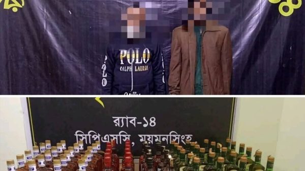 মকবুল হোসেন, ময়মনসিংহ জেলা প্রতিনিধি: ময়মনসিংহ সিপিএসসি, র্যাব-১৪, কর্তৃক ৭২ (বাহাত্তর) বোতল বিদেশী মদসহ ০২ জন মাদক কারবারিকে গ্রেফতার করা হয়েছে। ময়মনসিংহ সিপিএসসি, র্যাব-১৪, এর একটি আভিযানিক দল গোপন সংবাদের