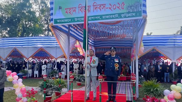 স্টাফ রিপোর্টার,মোঃ রেজাউল হক কুড়িগ্রামঃ রাজারহাটে নানা আয়োজনের মধ্যে দিয়ে মহান বিজয় দিবস পালিত হয়েছে। মঙ্গলবার(১৬ই ডিসেম্বর) সূর্যোদয়ের সাথে সাথে উপজেলা পরিষদ চত্বরে অস্থায়ী মুক্তিযোদ্ধা স্মৃতিস্তম্ভে ৩১ বার তোপধ্বনির মধ্যদিয়ে